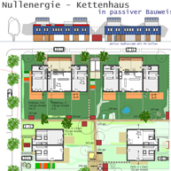 Durch die konsequent nach Süden orientierte Bebauung werden optimale solare Energiegewinne erzielt. Die Anordnung ermöglicht eine ganzjährige Besonnung der Südfassaden. Die verschatteten Gebäudenordseiten werden für Erschließung und PKW-Stellplätze genutzt.