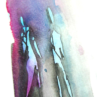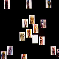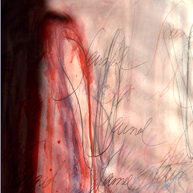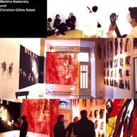 Martina Nadansky hat für den benachbarten Raum eine extreme gegenteilige Atmosphäre erzeugt- mit einem Feuerwerk an farbigen Collagen, Aquarellen und Gouachen und großformatigen frei hängenden Leinwänden, in deren Mittelpunkt immer der Mensch/ die Figur steht, einer inszenierten effektvollen szenischen Beleuchtung, der Öffnung nach außen (Schaufenster, Zugang + Party).