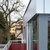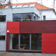 Eine bestehende Doppelhaushälfte aus den 30er Jahren in Berlin Weißensee wurde für die neue Familiennutzung umgebaut und um Wohn- und Arbeitsräume auf 2 Geschossen erweitert. Der Baukörper staffelt sich in 2 ablesbare Bauteile und bezieht die jeweilige Höhe, Kubatur, Ausrichtung, seine Materialien, Farben und auch die Konstruktion aus den Rahmenbedingungen: der Nachbarbebauung, der Traufhöhe und der Nutzung. Der neue Holzanbau wurde bewußt mit Plattenmaterial verkleidet (Trespa), der massive Altbau hell verputzt. Hinter der neuen Gestaltung des Eingangsbereiches verbirgt sich allerdings der alte Einganserker- hier wurden die Baukörper neu verknüpft. Die neuen Wohnräume haben innen sichtbare Holzdecken und öffnen sich in beiden Geschossen zum Gartenraum. Insgesamt wird Alt und Neu in der Gestaltung betont aufgenommen durch Material, kontrastreiche Farbe und die Raumzuschnitte.