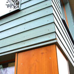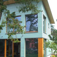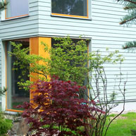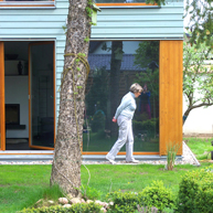 Der große Erweiterungbau von 2010 bildet nun mit dem Bestand eine Anlage, die den Garten rahmt und sich dorthin nach Westen und Südwest mit vielen Fensterflächen öffnet. Durch das offene Pultdach entstehen im Inneren viele interessante ein- und zweigeschossige Räume und Ausblicke, die auf die unterschiedlichen Nutzungen eingehen. Die südwestliche Eckverglasung wird innen durch einen 2-geschossigen Luftraum mit offener Schlafgalerie begleitet. Die Holzfassade (Keil-Stülp-Schalung) soll den Charakter des „Wald“-Grundstücks unterstreichen und bezieht sich mit ihrer kühlen Blau-Grau-Grün-Farbigkeit komplementär auf die dunklen Rot-Violett-Töne des Bestandes.