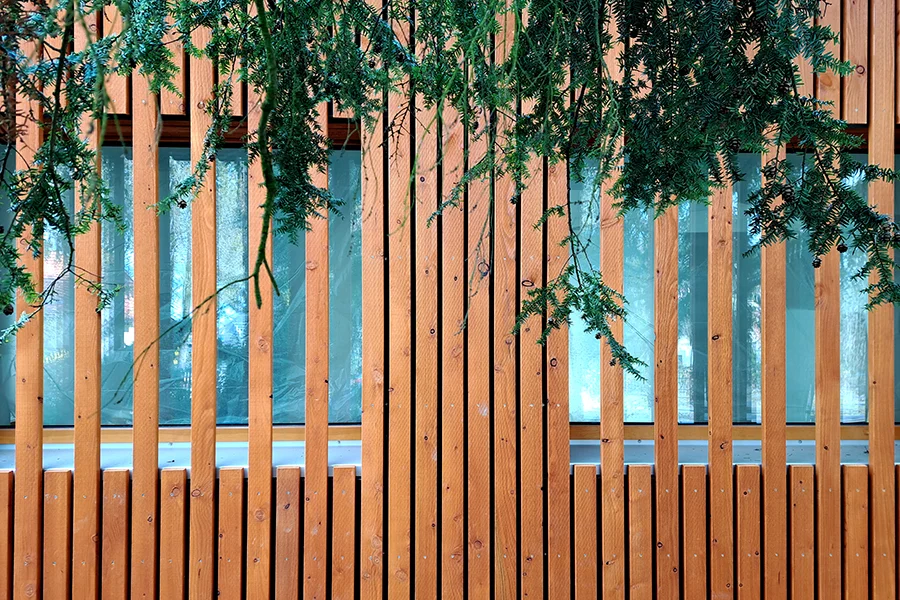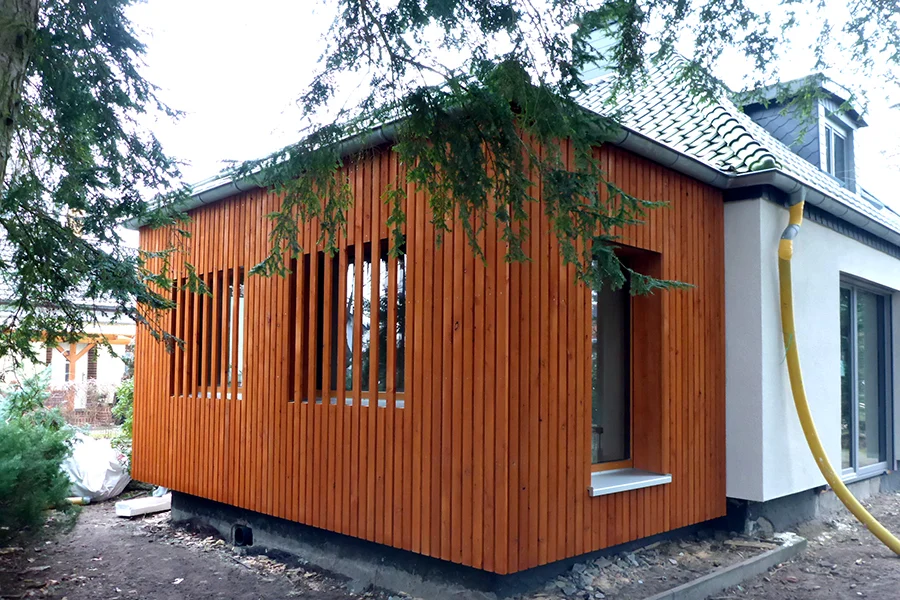 Die auffällige Holzfassade mit dahinterliegenden Fensteröffnungen bietet für das Wohnzimmer Filter und Sichtschutz zur Strasse hin. Gleichzeitig ist sie die neue Visitenkarten des Umbaus.