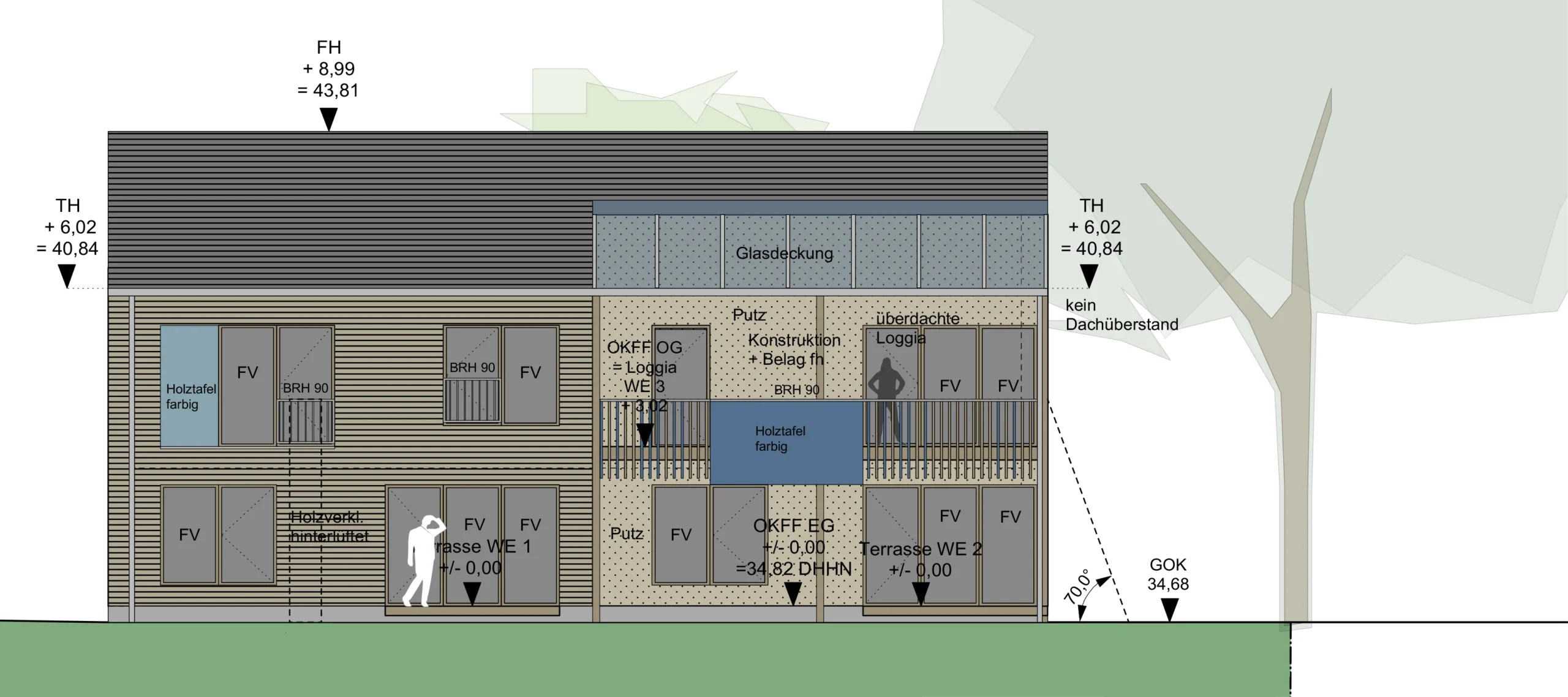 Die Bebauung springt von der Bauflucht zurück und markiert einen Freiraum – betont somit den Ortseingang. Diese auflockernde Geste nimmt die gegenüber geplante Gebäudestellung auf. Die Traufständigkeit und Baumasse der umliegenden Gebäude werden aufgegriffen. Aus Gründen des Baumschutzes (Kronen- und Wurzelbereich der vorhandenen Straßenbäume) und des Abstands von einer tangierenden Gasleitung kommt die Einhaltung einer Bauflucht mit den Gebäuden Nr. 7 ff nicht in Frage. Daher sitzen beide Häuser und ihre Nebengebäude zurückgesetzt. Um sich nicht gegenseitig zu verschatten, sind sie versetzt angeordnet.