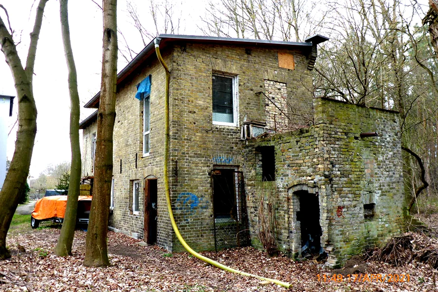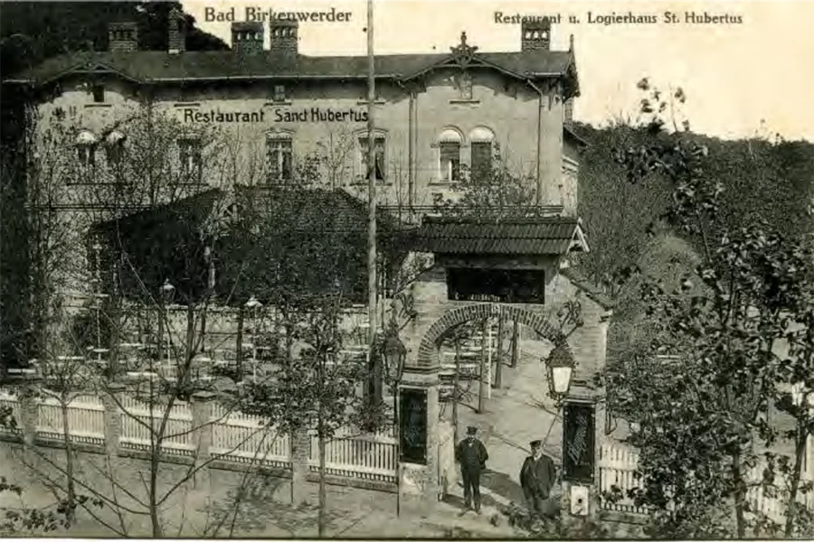 Der Bestandsbau wurde 1903 als „Restaurant und Logierhaus St. Hubertus“ vom Maurermeister Carl Iden gebaut, Bauherr war der Berliner Leo Blum. Birkenwerder hatte sich Anfang des 20. Jahrhunderts zu einem beliebten Ausflugs- und Erholungsort der Berliner Stadtbevölkerung entwickelt. In den 20er Jahren gab es ca. 36 Gaststätten und Cafés, dazu viele Pensionen. In mindestens 10 Einrichtungen gab es große Säle, teilweise mit Bühneneinrichtungen, dazu große bis sehr große Biergärten.1932 mußte das Restaurant „St. Hubertus“ zwangsversteigert werden. Im September 1933 wurde hier eine Gebietsführerschule der Hitlerjugend Berlin eingerichtet. Nach 1945 zog eine Filiale der staatlichen Versicherung der DDR in die Räume. Nach der Wiedervereinigung lagen Grundstück und Gebäude brach, bis vor einigen Jahren ein neuer Eigentümer mit der Sanierung begann.