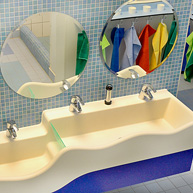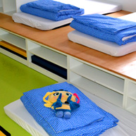Der Waschraum ist gleichzeitig Wasserspielstation, Badeplatz, Wickelstelle, WC-Lernort und Reinigungszimmer. Das Raummotiv ist hier das Wasser selbst. Verschiedene Blautöne im Fliesenboden und an den Wänden unterstreichen den Charakter.