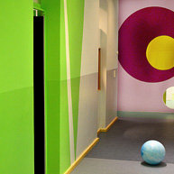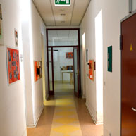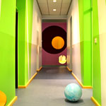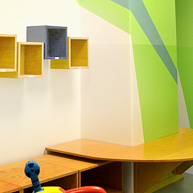 Die Kita Mima in Berlin Wilmersdorf hat sich in einem Bestandgebäude von 1963 mit Gartengelände eingerichtet. Der bestehende Flurgrundriss mit seitlich angeordneten Einzelräumen konnte aus statischen Gründen nicht wesentlich verändert werden. Einige kleinere Eingriffe waren jedoch nötig, um die neuen Funktionen Garderobe, Waschraum, Gruppenräume aufzunehmen. Im Gestaltungskonzept geht es um die eindeutige Umwandlung eines städtischen Bürogrundrisses in eine kindgerechte Umgebungsstimmung. Mit verschiedenen Raummotiven – Wald, Berge und Blumenwiese – haben wir versucht, ein Stück Natur in die Stadt zu bringen. Farbe, Licht und Materialien unterstützen diese Raummotive.
