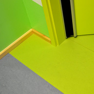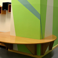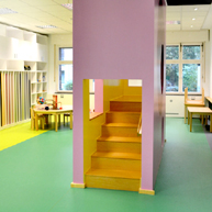 Im Eingangsbereich wird man – vom Stadtquartier hereinkommend- begrüßt von einer lichten Waldstimmung: runde „Stamm“bänke laden zum Sitzen ein, die Garderobenboxen hängen wie Nistkästen auf verschiedenen Höhen, das Farbspiel erzeugt ein Gefühl von Sonnenstrahlen, die durch das Blätterdach scheinen.