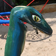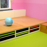 Im Gruppenraum der 0-3-jährigen lädt ein Gebirge aus Holzpodesten in 3 Grüntönen zu Krabbeltouren ein. Eine Holzwand mit runden Sichtfenstern auf verschiedenen Höhen- die „Berghütte“ in der Analogie des Gebirges- schützt vor Blicken und regt zu vielfältigen Höhlen- und Hausspielen an.