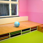 Der vorhandene große Gruppenraum des Bestandes wird mit einer leicht bedienbaren, flexiblen Trennwand in 2 Gruppenräume geteilt. Die Wandelemente sind miteinander verbunden und können auch einzeln zur Raumerzeugung platziert werden. Das Spielobjekt ROSA ist Turm, Höhle, Kaufmannsladen, Kasperletheater …..