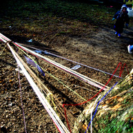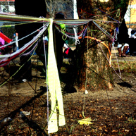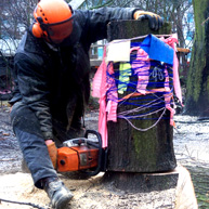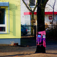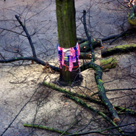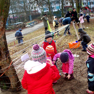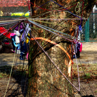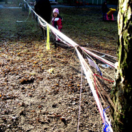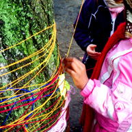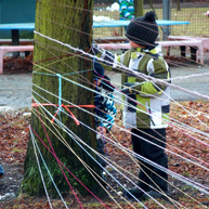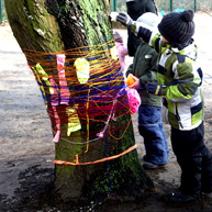 Diese notwendigen Maßnahmen haben wir mit den 14o Kindern der Kita in einer feierlichen „Baumverabschiedung“ inszeniert. Dazu haben wir die zuerst entsprechenden Bäume mit einer langen Kinderschlange singend umrundet, und anschließend mit meterlangen Wollfäden verbunden, verknüpft, verknotet, vernetzt, verkreuzt und verschränkt. Die Kinder haben den Bäumen dann kleine Briefe und Wunschzettel mit auf den Weg gegeben und sich mit Baum- und Naturliedern verabschiedet.