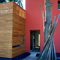Der schützenswerte Baum – eine Akazie – gab den Anlass, die Raumfunktionen des Wohnhauses zu teilen und mit zwei Baukörpern einen Eingangshof zu bilden. Auf der Gartenseite entsteht so ein geschützter Terrassenbereich. Unterstützt wird dieses Prinzip durch die unterschiedliche Ausprägung der Baukörper in Höhen, Proportionen, Farbe und Material.
