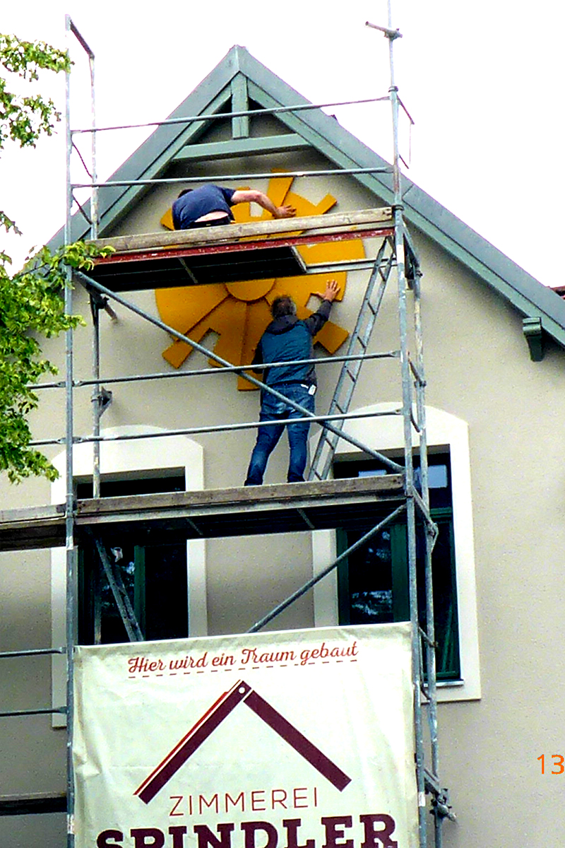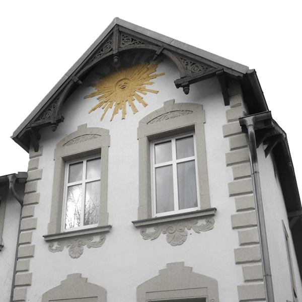 Das Sonnenhaus fällt auf durch seine gelbe Sonnenuhr im Giebelfeld auf der Strassenseite. Es ist Bestandteil einer Hausreihe mit seitlichem Nachbarhaus in städtischer Struktur. 2025 wird es energetisch saniert, umgebaut und erweitert. Die Sonnenuhr konnte im Sanierungsablauf nicht gehalten werden und wurde durch eine Neuinterpretation ersetzt.