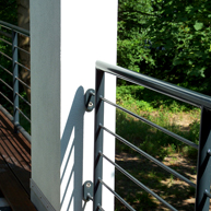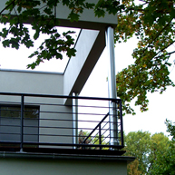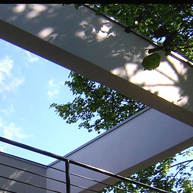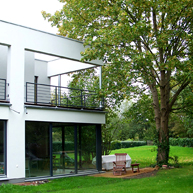Aus dem quadratischen Baufenster, der optimalen Lage auf dem Grundstück und dem Gestaltungswunsch der Baufamilie wurde der helle, gradlinige Kubus mit Flachdach abgeleitet. Besonderes Detail ist die Dachterrasse im Obergeschoss: um den Kubus in seiner Kontur zu halten, umschließt die obere Dachkante die Dachterrasse und bildet somit zusätzlich einen reizvollen Kontrast zur umgebenden Natur. In die entstehenden Freiräume können bei Bedarf flexible Segel als Witterungsschutz eingehängt werden. Der Begriff „Wolkenbügel“ erinnert an einen Entwurf des russischen Architekten El Lissitzky von 1924 – natürlich in einem etwas anderen Zusammenhang.